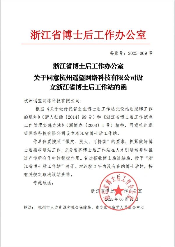 今年6月,经浙江省人力资源和社会保障厅批准,遥望科技正式获批准许设立浙江省博士后工作站(以下简称“工作站”),作为高层次人才培养与科研创新平台,工作站聚焦人工智能前沿领域,重点攻关AI智能体与大模型等核心技术,致力于推动学术前沿突破、关键技术研发与产业应用落地。7月,工作站迎来首位博士后研究员——李杨博士,正式开启科研人才培养与技术攻关的新阶段。