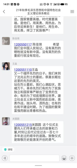 9月30日是全国第八个烈士纪念日,思政部专职教师在线上思政课堂组织学生集体观看了一场生动的爱国主义教育课。这堂课就是今天在天安门广场隆重举行的向人民英雄敬献花篮仪式,习近平等党和国家领导人出席了仪式。仪式的全过程在师生中产生了强烈的反响。艺术学院王仁杰说:“坚定信念,争做时代新人。百年薪火,世界已经见证中国青年的力量。在山河破碎时,你们追求真理、挥洒热血,唤醒了沉睡已久的东方巨人;在一穷二白时,你们发愤图强、投身建设,实现了迈进社会主义社会的伟大飞跃;在关键转折时,你们解放思想、砥砺奋进,创造了一个又一个彪炳史册的人间奇迹。”建筑学院刘敬凯表示:“时代在变,但青年人的生机和活力不变,青春的热血.-直相连,奋斗的誓言始终相通。为实现第二个百年奋斗目标,为实现中华民族伟大复兴的中国梦,且看新时代中国青年的青春活力和奋斗奉献,以青春之我助力中华民族伟大复兴、创造新的人间奇迹!请党放心,强国有我”。同学们在观看中纷纷热议,发表感想。