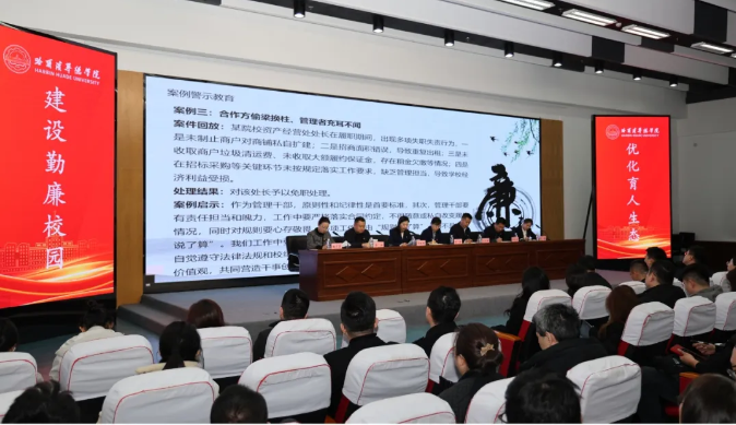 会上,纪委书记邓维娜首先对2025年度纪检监察工作进行部署。2025年学校纪委将牢牢把握纪检监察工作的政治属性,持续巩固深化党纪学习教育成果,锲而不舍落实中央八项规定精神;推进实施勤廉学校建设方案,强化事前预防,推动源头治理;紧盯学校中心工作对标对表,聚焦重点领域和关键环节,压紧压实责任链条,推动全面从严治党责任传导到边到底;结合各业务领域风险实际,结合重点工作开启时点,开展组合式、定制化廉洁教育培训,持续提升关键岗位群体、新任转任干部的廉洁自律意识;加大对腐败和违法违纪行为的惩处力度,切实形成强大震慑力,运用“全周期管理”方式,形成办案、治理、监督、教育的完整闭环;开展师德师风专项整治行动,聚焦关键领域提升监督效能;以加强作风建设为切入主动靠前抓民生,协同业务部门积极作为,高效解决师生反映强烈的急难愁盼问题,切实提升师生校园学习工作体验。随后,纪委书记邓维娜做案例警示教育,希望全体管理干部能以案为鉴,牢固树立红线意识,知止善为、廉而有为、放手敢为。