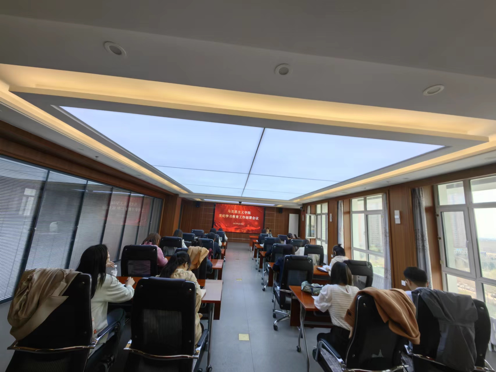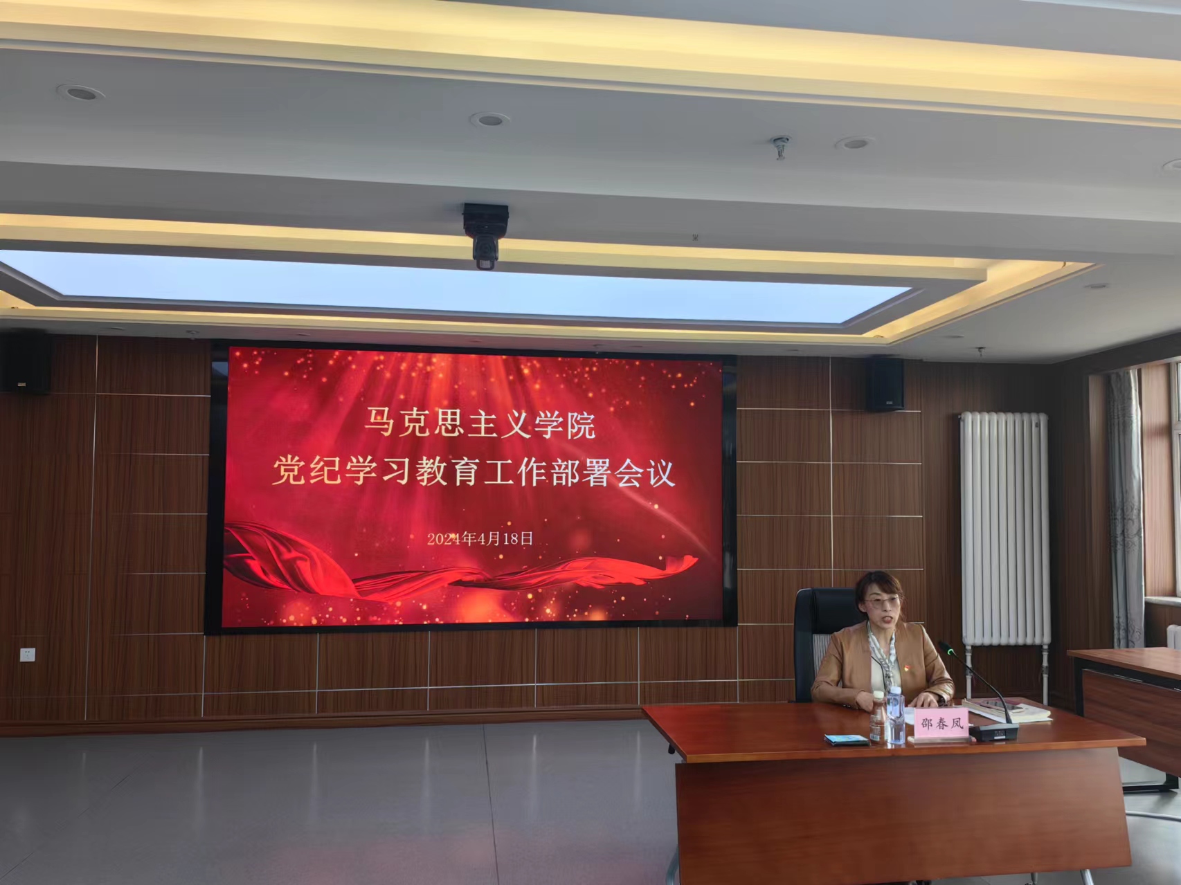 2024年4月18日下午,pp电子官方网站在行政楼9楼学生厅召开党员大会,启动部署学院党纪学习教育工作,全院党员教师参加会议,会议由党总支书记邵春凤主持。