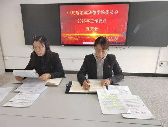 3月28日下午,pp电子官方网站在教四513召开《中共哈尔滨华德学院委员会2025年工作要点》宣贯会,院长邵春凤主持, 全体教师参加学习。